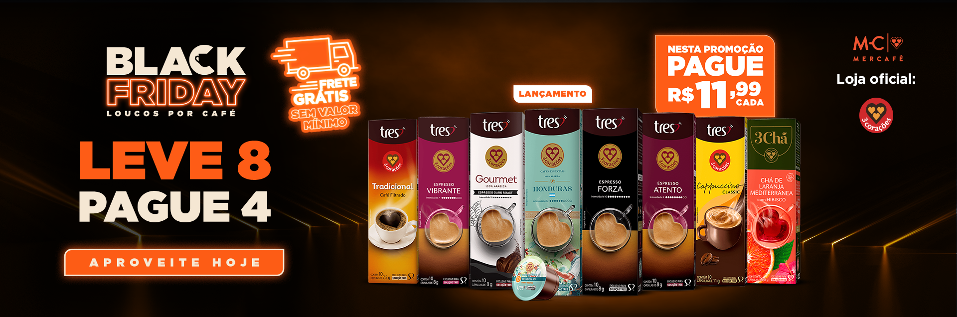 A Black Friday Mercafé chegou com uma oferta irresistível para os amantes de café: na compra de 8 cápsulas de café TRÊS®, você paga apenas 4, por R$11,99 cada. É a oportunidade perfeita para abastecer sua cozinha com sabores únicos e aproveitar o melhor do café com praticidade e qualidade.