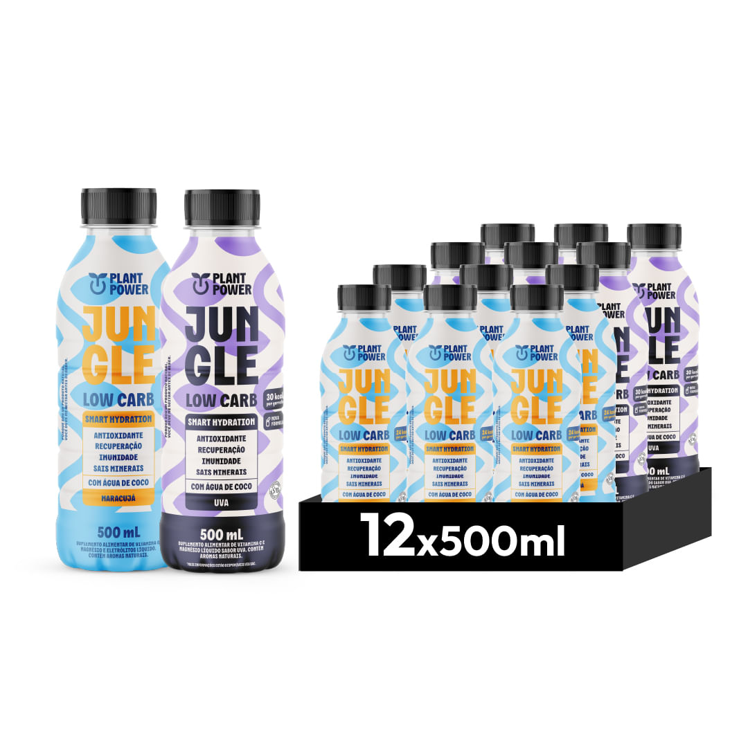 Jungle Low Carb Uva 500mL: O sabor Uva contém apenas 30 calorias por unidade. É feito com suco de frutas, água de coco e tapioca orgânica.