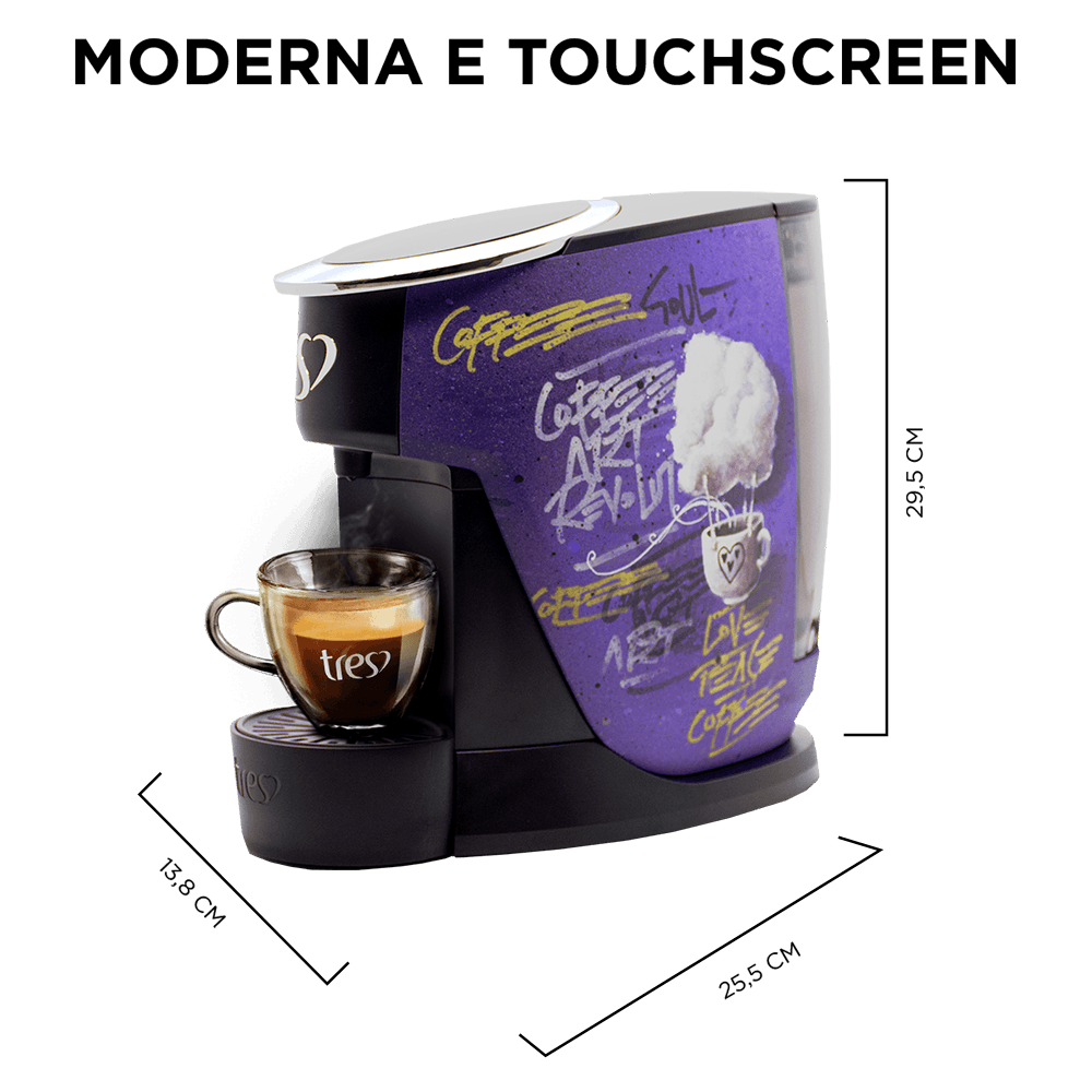 A Cafeteira Quase Nova Multibebidas Automática Touch TRES 3 Corações é moderna, elegante, compacta e touchscreen. Com um Design moderno e elegante, valoriza qualquer ambiente da sua casa, principalmente o cantinho do café. O destaque fica por conta do painel touchscreen, novidade neste modelo, cujos comandos são sensíveis ao toque. Além disso, a TOUCH é silenciosa, possui um compartimento interno para até 4 cápsulas usadas e sistema multipressão. Esta máquina de café quase nova representa uma escolha consciente e sustentável. Ao optar por um produto quase novo, você está contribuindo para a redução do desperdício e do consumo excessivo de recursos naturais. As máquinas da categoria “maquinas quase novas”, são produtos seminovos, que já tiveram uma primeira utilização e foram reembalados. Passaram por um rigoroso processo de reparo e higienização e estão em perfeito estado de funcionamento. Item pode apresentar pequenos sinais de uso ou marcas. Descrição do Produto e Especificações Técnicas: - Máquina de café quase nova modelo Touch TRES 3 Corações. - Design moderno e compacto, ideal para qualquer ambiente. - Painel touchscreen para uma operação simples e intuitiva. - Funcionamento silencioso para uma experiência tranquila de café. - Compartimento interno com capacidade para até 4 cápsulas. - Sistema multipressão que permite a preparação de cafés espressos, filtrados, cappuccinos, bebidas cremosas e chás. - Compatível exclusivamente com cápsulas TRES®. - As máquinas TRES® são livres de BPA e possuem garantia de 5 anos*. Por favor, consulte o manual do produto para obter instruções detalhadas sobre como operar e cuidar da sua Cafeteira Quase Nova Multibebidas Automática Touch TRES 3 Corações. *A partir da data de emissão da nota fiscal, incluindo 90 dias do prazo legal. Garantia válida para máquinas adquiridas a partir de Janeiro'23