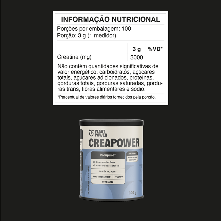 - Creapower: Aumente sua força, potência e resistência em exercícios de alta intensidade e curta duração. Nossa creatina monohidratada de alta pureza oferece 100 doses de 3g para você alcançar seus melhores resultados.