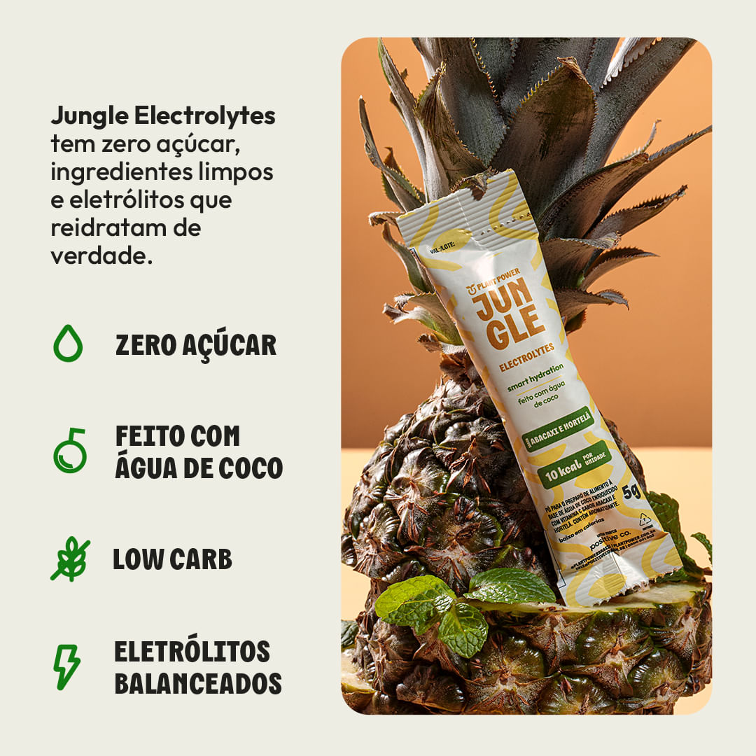 O Sunset Bliss faz parte da linha Low Carb do Jungle Electrolytes e traz um sabor leve e refrescante de tangerina com morango.
