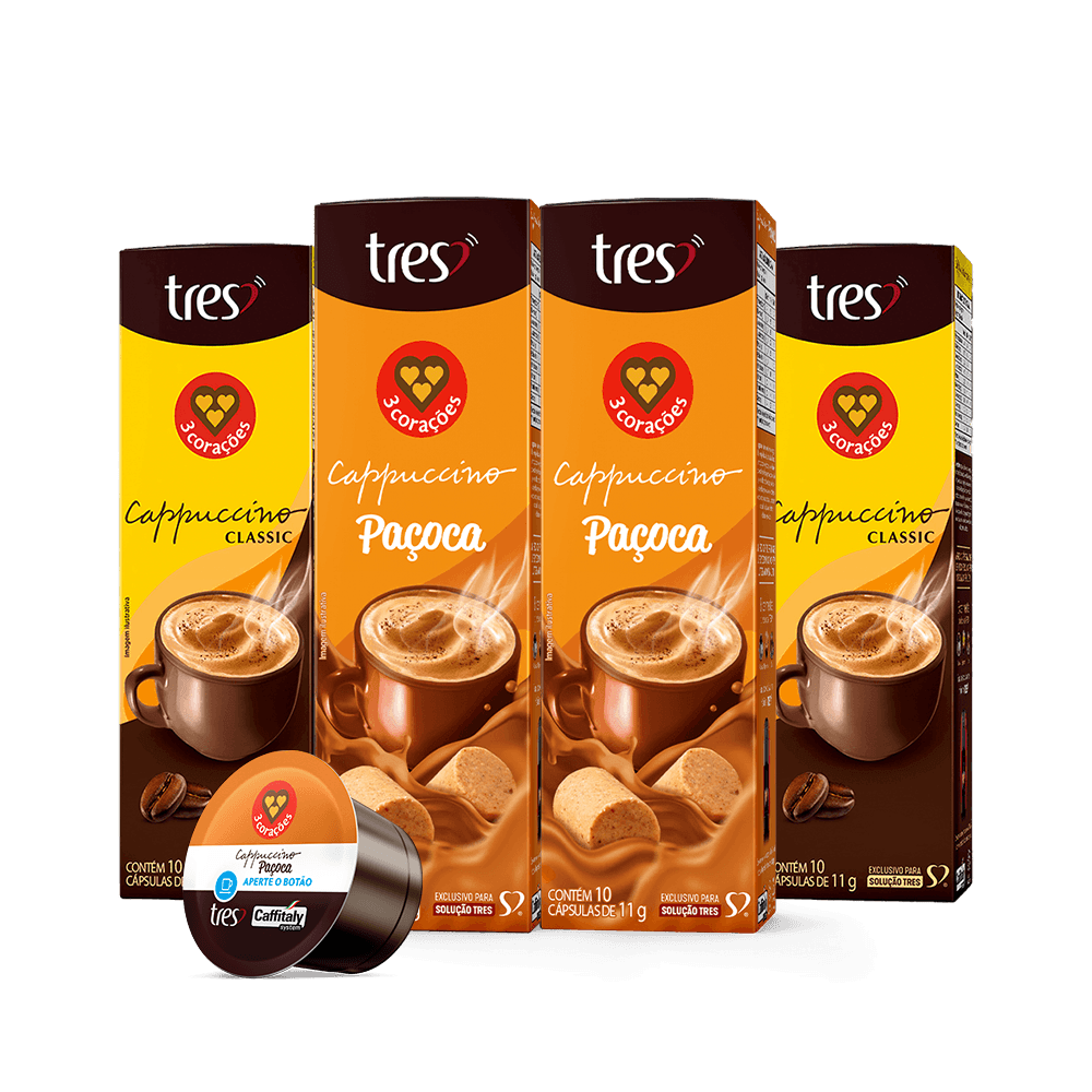 O Kit Cappuccino Classic + Cappuccino Paçoca é ideal para quem aprecia bebidas cremosas e cheias de sabor. São 40 cápsulas exclusivas para o sistema TRES®, sendo 20 de Cappuccino Classic, com seu sabor tradicional e equilibrado, e 20 de Cappuccino Paçoca, que combina a cremosidade do cappuccino com o toque adocicado e marcante da paçoca. Perfeito para variar o sabor e tornar cada momento especial.